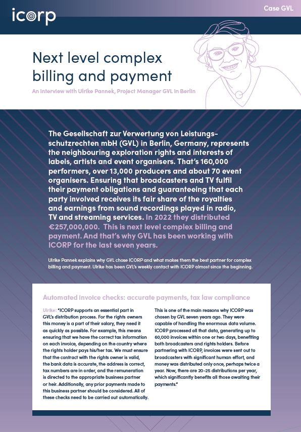 The Gesellschaft zur Verwertung von Leistungsschutzrechten mbH (GVL) in Berlin, Germany, represents the neighbouring exploration rights and interests of labels, artists and event organisers. That’s 160,000 performers, over 13,000 producers and about 70 event organisers. Ensuring that broadcasters and TV fulfil their payment obligations and guaranteeing that each party involved receives its fair share of the royalties and earnings from sound recordings played in radio, TV and streaming services. In 2022 they distributed €257,000,000. This is next level complex billing and payment. And that’s why GVL has been working with ICORP for the last seven years.